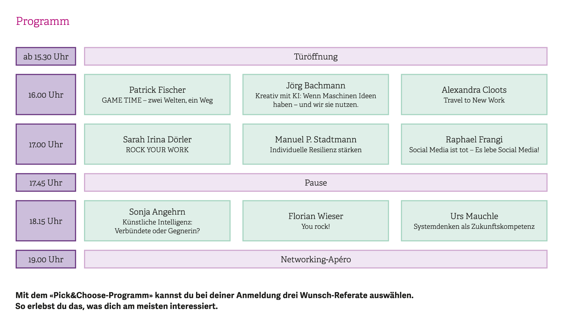 Am Inspiration-Day OST kannst du dir dein ganz persönliches Programm zusammenstellen. Wähle bei deiner Anmeldung deine drei Wunsch-Referate aus dem nachfolgenden Programm aus. So hörst du nur was dich interessiert. Die Platzzahl in den einzelnen Sessions ist begrenzt.